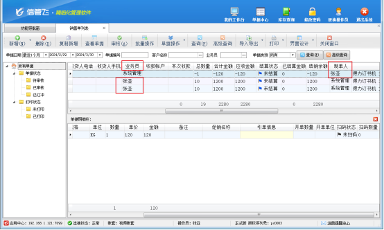 權(quán)限設(shè)置完成后,使用操作員賬號(hào)登錄軟件,在銷售單列表中可以看到操作員賬號(hào)只能查看到業(yè)務(wù)員為自己及本人所開的單據(jù),如下圖所示。