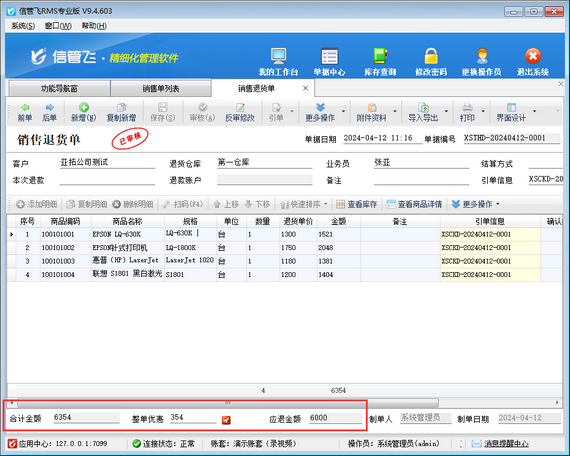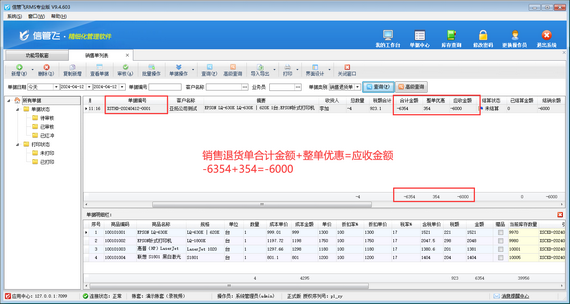 在銷售單列表中,銷售退貨單合計金額和應(yīng)收金額為負數(shù)顯示,合計金額 + 整單優(yōu)惠=應(yīng)收金額,而不是合計金額 - 整單優(yōu)惠=應(yīng)收金額,如下圖所示。