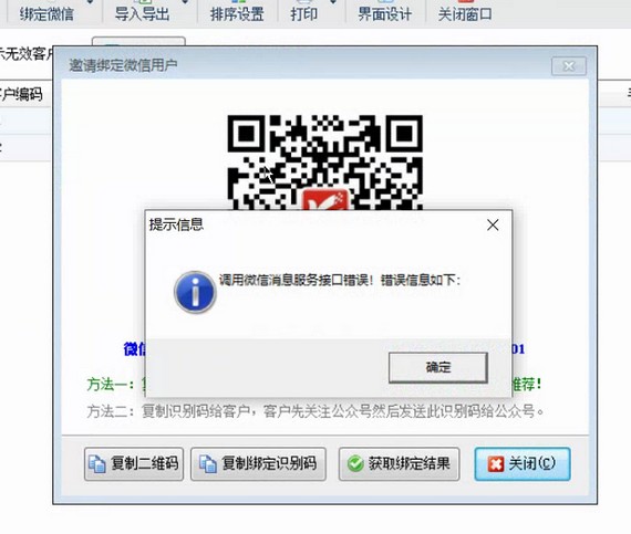 有用戶在進行業(yè)務員和客戶綁定操作時,綁定出錯,系統(tǒng)彈出提示信息“調用微信消息服務接口錯誤!”如下圖所示。