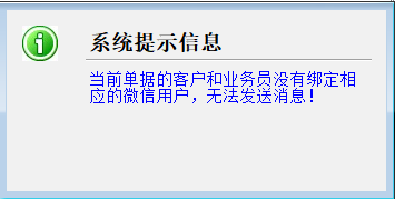 信管飛RMS、信管飛出納記賬軟件、信管飛送貨單軟件均支持微信消息增值服務(wù)功能,部分用戶在開單保存單據(jù)時會出現(xiàn)以下提示:“當(dāng)前單據(jù)的客戶和業(yè)務(wù)員沒有綁定相應(yīng)的微信用戶,無法發(fā)送”,如圖: