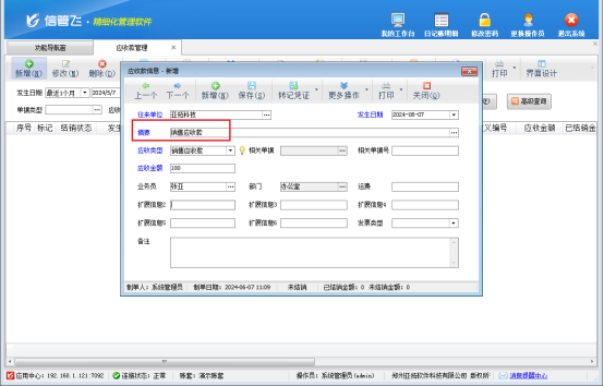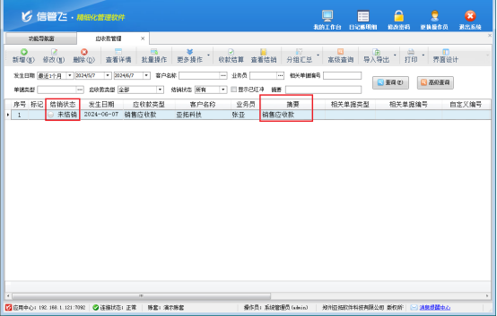 功能導(dǎo)航欄點(diǎn)往來管理-》應(yīng)收款管理,新增一個(gè)應(yīng)收款,摘要可根據(jù)實(shí)際需求自行進(jìn)行錄入,信息錄入完成后點(diǎn)擊保存按鈕進(jìn)行保存,保存后,應(yīng)收款管理界面增加一條未結(jié)銷的銷售應(yīng)收款記錄。