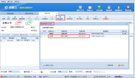 有兩種方式進行查看,一種是采購訂單界面查看。打開采購訂單界面,在工具欄“更多操作”下點擊“查看訂單執行情況”,彈出界面可以查看采購入庫單的單據日期,如下圖所示: