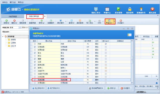 第二種方式:采購訂單列表界面查看。在采購訂單列表界面。點擊工具欄“界面設計”,勾選顯示“完成日期”并保存界面設計,在采購訂單列表界面“完成日期”中顯示完成日期(即入庫日期),此方式可批量查看采購訂單的入庫日期。如下圖所示: