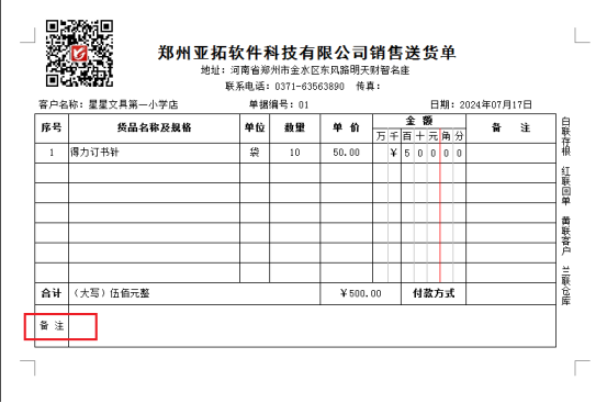 設(shè)置完成后,點(diǎn)擊保存按鈕,預(yù)覽查看打印樣式,此時(shí)備注豎向顯示,如圖: