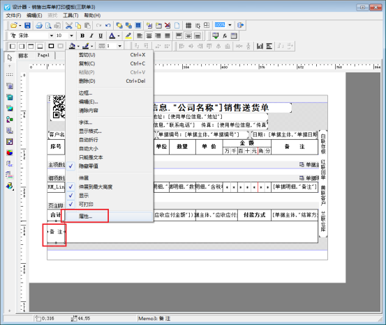 開單界面點(diǎn)打印—》打印格式設(shè)計(jì)—》設(shè)計(jì)格式,進(jìn)入模板設(shè)計(jì)器界面,選中備注文本框,右鍵點(diǎn)擊屬性,如下圖所示: