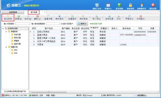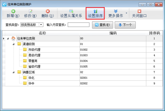 功能導航窗點“基礎資料”—》“客戶信息”即可進入“客戶信息”界面,工具欄點“單位類別”進入往來單位類別維護界面,點“設置排序”按鈕,可進行排序,點“自動排序”會按照編碼自動進行排序;點“上移”、“下移”按鈕可向上、向下調整顯示位置,如圖所示。