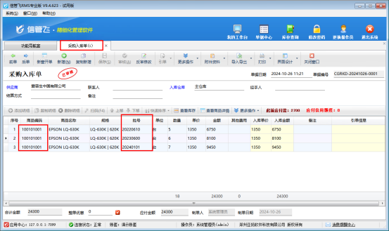 啟用批號管理后打開采購管理“采購入庫單”,界面設計單據明細中勾選顯示出“批號”,新增采購入庫單,選擇同一個商品,錄入不同批號不同入庫數量,如下圖所示: