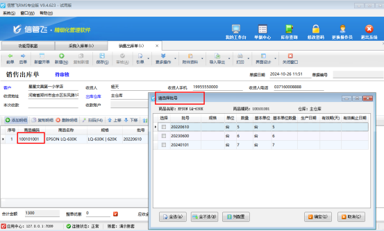 商品入庫完成后,點擊銷售管理“銷售出庫單”,選擇此商品出庫,會自動彈出選擇批號界面,勾選不同批號進行出庫,如下圖所示: