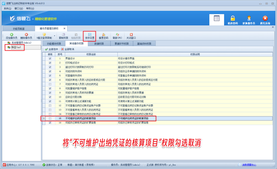 解決方法如下:使用系統(tǒng)管理員賬號(hào)登錄軟件,在功能導(dǎo)航窗點(diǎn)擊“系統(tǒng)管理”—》“操作員及授權(quán)”打開(kāi)操作員管理及授權(quán)界面,選擇操作員賬號(hào),在“其他操作權(quán)限”界面將“不可維護(hù)出納憑證的核算項(xiàng)目”權(quán)限勾選取消,然后保存權(quán)限設(shè)置,如下圖所示。