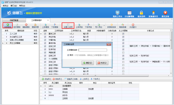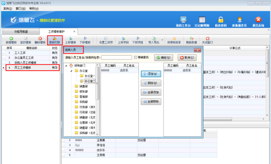 支持軟件啟用工資模板權(quán)限,在工資模板維護(hù)界面支持設(shè)置每個(gè)模板的可查看人員,選擇后使用操作員登錄在工資模板維護(hù)界面僅顯示允許自己查看的工資模板。