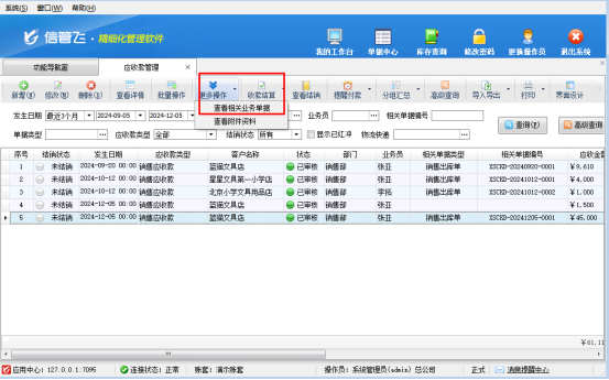 修改需要打開對(duì)應(yīng)的單據(jù)進(jìn)行修改單價(jià)或者數(shù)量進(jìn)行更新金額。點(diǎn)擊工具欄“更多操作”下的“查看相關(guān)業(yè)務(wù)單據(jù)”會(huì)打開業(yè)務(wù)單據(jù)界面,單據(jù)修改后更新應(yīng)收金額,如下圖所示: