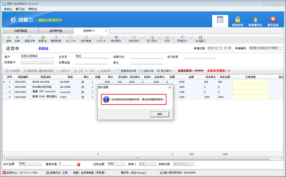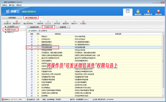 出現以上問題的原因是:當前登錄的操作員賬號沒有可發送微信消息的權限。