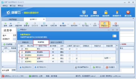 單據界面,點擊“界面設計”,在單據明細項勾選顯示折扣率、折扣單價,如圖所示: