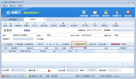 檢查商品明細,該商品是否啟用計重方式,在單據界面選中商品點擊查看商品詳情,點擊修改,取消勾選啟用計重方式(或者在基礎資料---商品信息界面修改),重新添加下商品明細或者修改下商品數量或單價重新計算金額。