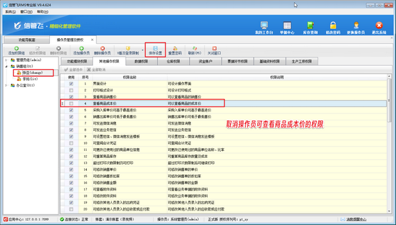以信管飛RMS為例,軟件支持為多個操作員設(shè)置賬號,并詳細劃分權(quán)限。對于不希望員工查看的商品成本價格,設(shè)置過程簡單明了。只需在功能導(dǎo)航窗選擇“系統(tǒng)管理”進入“操作員及授權(quán)”界面,輕松取消對應(yīng)賬號的“查看商品成本價”權(quán)限。