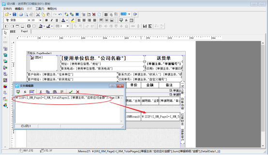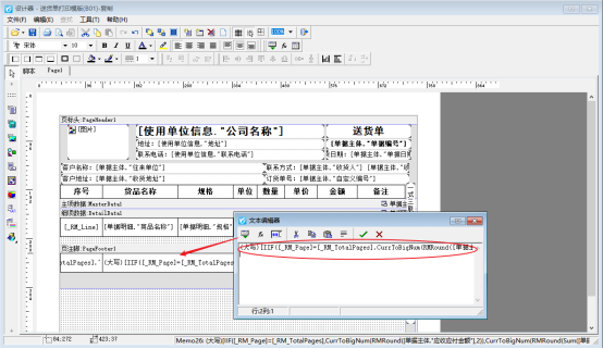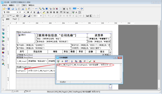 在業(yè)務(wù)單據(jù)界面點(diǎn)擊打印----打印格式設(shè)計(jì)----設(shè)計(jì)格式,在模板設(shè)計(jì)器界面,頁(yè)注腳里邊放入文本框,文本顯示:如當(dāng)前頁(yè)等于總頁(yè)數(shù),則顯示“總計(jì)”,否則顯示“小計(jì)”代碼如下:[IIF([_RM_Page]=[_RM_TotalPages],'合計(jì)總金額','本頁(yè)小計(jì)')];