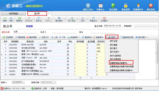 3.批量更新盤點數(shù)量:商品選擇完成后,在明細工具欄的盤點操作下,選擇 “批量更新盤點數(shù)量為 0”,軟件會直接批量設置商品盤點數(shù)量為 0,方便又高效。