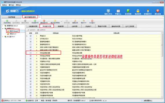 那么,如何根據企業實際需求,靈活設置操作員的微信消息發送權限呢?在信管飛RMS系統中,只需簡單幾步即可輕松實現。通過“系統管理”下的“操作員及授權”功能,進入操作員權限配置界面,即可對特定操作員的“可發送微信消息”權限進行開啟或關閉。