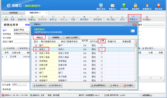但如果您的企業(yè)不需要在開單時錄入收貨人信息,操作起來也非常簡單。只需在開單界面點擊上方工具欄的“界面設計”,選擇“單據(jù)主體”,在眾多數(shù)據(jù)項中找到“收貨人”,然后取消必填項的勾選符號,最后保存設置即可。