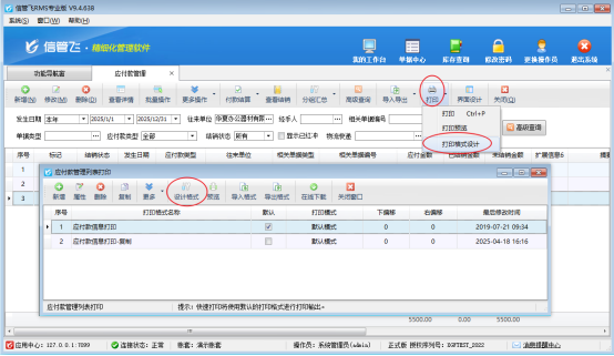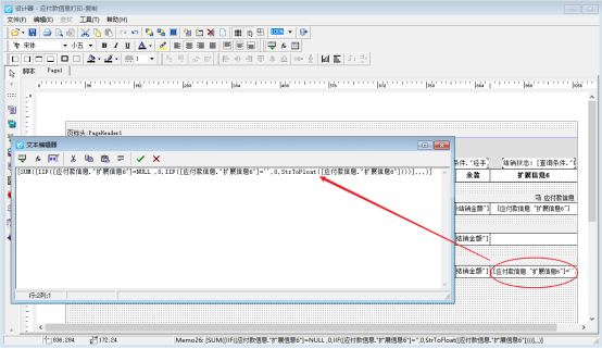 在應(yīng)付款管理界面點(diǎn)擊打印---打印格式設(shè)計(jì),選中模板點(diǎn)擊設(shè)計(jì)格式;進(jìn)入模板設(shè)計(jì)器,雙擊擴(kuò)展信息6對(duì)應(yīng)合計(jì)的文本框,輸入計(jì)算公式:[SUM([IIF([應(yīng)付款信息."擴(kuò)展信息6"]=NULL,0,IIF([應(yīng)付款信息."擴(kuò)展信息6"]='',0,StrToFloat([應(yīng)付款信息."擴(kuò)展信息6"])))],,,)]
