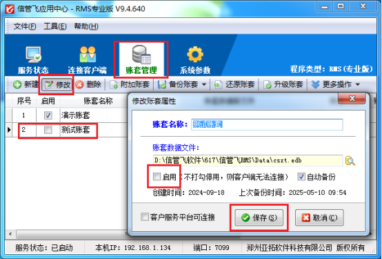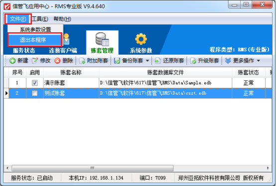 保存修改后,再次查看賬套列表,會發(fā)現(xiàn)該帳套的啟用對勾已經(jīng)取消,這表明該賬套已成功停用。為了確保設置生效,可以點擊“文件”—》“退出本程序”,先退出應用中心,然后再重新運行紅色應用中心。