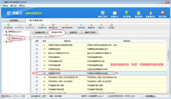 在功能導(dǎo)航窗點(diǎn)擊“系統(tǒng)管理”—》“操作員及授權(quán)”打開(kāi)操作員管理及授權(quán)界面,選擇操作員賬號(hào),在“其他操作權(quán)限”界面將“可查看附件資料”權(quán)限取消勾選,然后保存權(quán)限設(shè)置,如下圖所示。