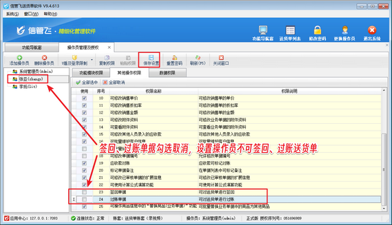 配置過程簡潔直觀:管理員進(jìn)入【系統(tǒng)管理】模塊,通過【操作員及授權(quán)】界面即可完成權(quán)限分配。以操作員“張亞”為例,僅需取消勾選“簽回單據(jù)”與“過賬單據(jù)”權(quán)限,保存后系統(tǒng)立即生效。