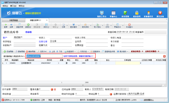 信管飛RMS軟件開單支持選擇輸入、直接輸入和掃描條形碼等方式輸入商品。按條形碼輸入商品(條形碼需提前在商品信息中添加好)時,掃描后提示檢索不到商品,如下圖所示,這種如何解決?