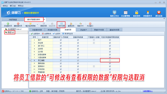 使用系統(tǒng)管理員賬號登錄軟件,在功能導航窗點擊“系統(tǒng)管理”—》“操作員及授權”打開操作員管理及授權界面,選擇操作員賬號,在“數據權限”界面將員工借款“可修改有查看權限的數據”的權限勾選取消,然后保存權限設置,如下圖所示。