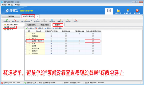 解決方法如下:使用系統(tǒng)管理員賬號登錄軟件,在功能導(dǎo)航窗點(diǎn)擊“系統(tǒng)管理”—》“操作員及授權(quán)”打開操作員管理及授權(quán)界面,選擇操作員賬號,在“數(shù)據(jù)權(quán)限”界面將送貨單、退貨單的“可修改有查看權(quán)限的數(shù)據(jù)”的權(quán)限勾選上,然后保存權(quán)限設(shè)置,如下圖所示。