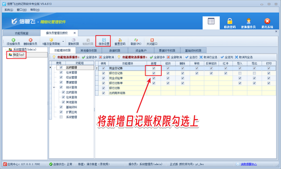 使用系統管理員賬號登錄軟件,在功能導航窗點擊“系統管理”—》“操作員及授權”打開操作員管理及授權界面,選擇操作員賬號,在其右側的功能模塊權限內選擇“出納管理”,將現金(銀行)日記賬的“新增”權限勾選上,然后保存權限設置,如下圖所示。