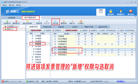 系統管理員賬號登錄軟件,在功能導航窗點擊“系統管理”—》“操作員及授權”,進入“操作員管理及授權”界面,選擇操作員賬號“張亞”,在其右側的功能模塊權限內選擇“票據管理”模塊,將進/銷項發票管理的“新增”權限勾選取消,然后保存權限設置,如下圖所示。