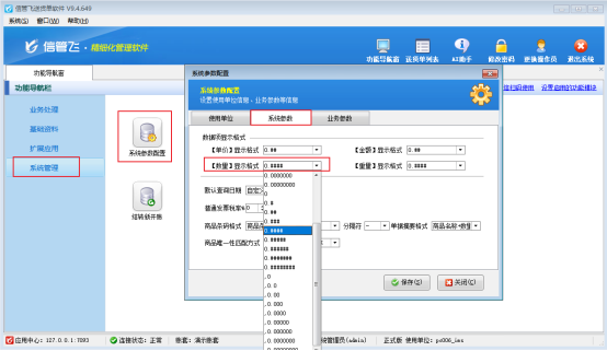 在功能導(dǎo)航窗點(diǎn)擊“系統(tǒng)管理”—》“系統(tǒng)參數(shù)配置”—》“系統(tǒng)參數(shù)”,在“系統(tǒng)參數(shù)”界面可以設(shè)置數(shù)據(jù)項(xiàng)顯示格式,調(diào)整數(shù)量顯示格式擴(kuò)展數(shù)值的也會(huì)改變,設(shè)置完之后點(diǎn)擊“保存”按鈕保存配置,如下圖所示: