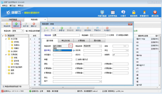 在功能導(dǎo)航欄“基礎(chǔ)資料”----“商品信息”模塊下新增商品性質(zhì)“服務(wù)及費(fèi)用”的商品,商品名稱(chēng)命名為“運(yùn)費(fèi)”,如下圖所示,搬工費(fèi)和跑腿費(fèi)操作方式一樣。
