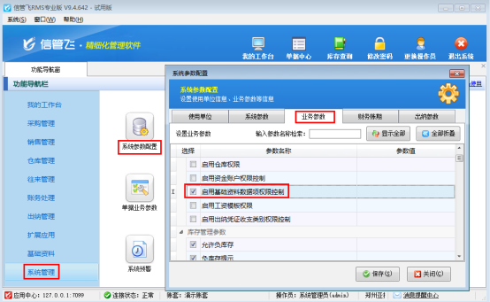 進(jìn)入「系統(tǒng)管理」→「系統(tǒng)參數(shù)配置」→「業(yè)務(wù)參數(shù)」,在“系統(tǒng)安全及權(quán)限參數(shù)”中勾選“啟用基礎(chǔ)資料數(shù)據(jù)項(xiàng)權(quán)限控制”,保存即可。