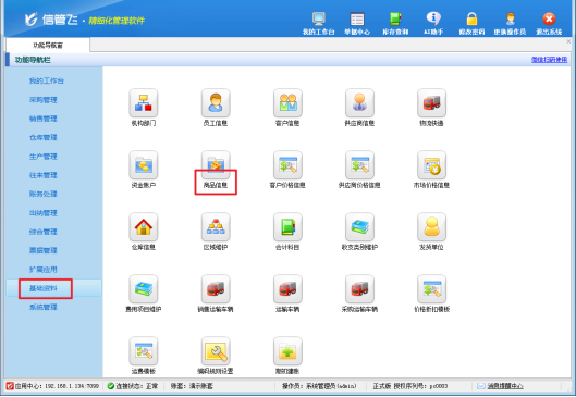 登錄軟件,在功能導航窗中點擊“基礎資料”-》“商品信息”,進入“商品信息”界面,這里匯聚了企業(yè)所有商品的相關信息,是進行貨位設置操作的起點。