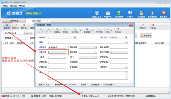 信管飛RMS軟件通過操作員權限控制功能模塊訪問權限。若操作員賬號未被分配“查看商品銷售價”的操作權限,將導致金額字段不可編輯。