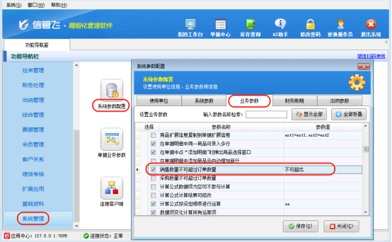 三步輕松配置,操作簡(jiǎn)單易懂 1.登錄系統(tǒng)后,進(jìn)入系統(tǒng)管理模塊,依次點(diǎn)擊 “系統(tǒng)參數(shù)配置”—“業(yè)務(wù)參數(shù)”,在參數(shù)列表中找到 “銷售數(shù)量不可超過訂單數(shù)量” 選項(xiàng);