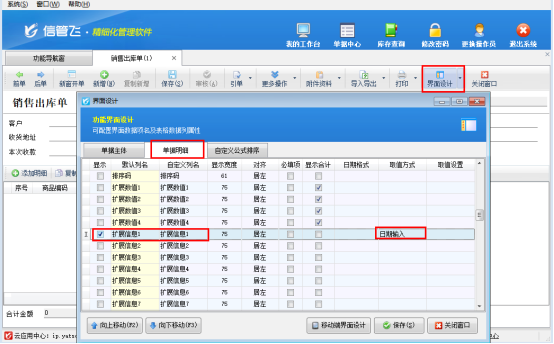 2.進入界面設計的單據明細設置板塊,勾選需要顯示的擴展信息項(如擴展信息 1),名稱可自定義修改;