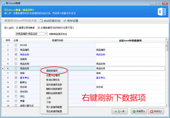 信管飛軟件支持通過Excel導入數(shù)據(jù),通過Excel數(shù)據(jù)導入可以將數(shù)據(jù)方便快捷的導入到軟件中,省去了使用初期大量的數(shù)據(jù)的錄入所要消耗的時間及人力物力,并避免人為錄入的誤差,使數(shù)據(jù)錄入的簡單、準確、高效。對于有獨立雙單位的商品,系統(tǒng)支持錄入副單位,部分客戶在導入商品信息后,會發(fā)現(xiàn)副單位沒導入成功,這通常是由于數(shù)據(jù)項沒成功對應導致的。