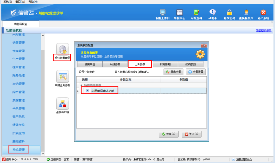 第一步,啟用功能,快速配置。在功能導航窗點擊“系統管理”—“系統參數配置”,在“業務參數”的特殊功能參數中,勾選“啟用單據確認功能”,點擊保存即可完成配置。