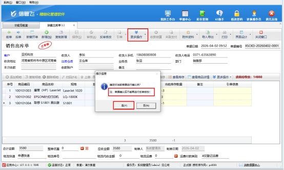 第二步,單據審核,發起確認。功能啟用后,在銷售管理等模塊新開單據(以銷售出庫單為例),完成單據填寫、保存并審核后,點擊單據界面的“更多操作”,選擇“確認單據”選項,系統會自動彈出提醒“單據確認后不能再進行反審修改!”,雙重提醒規避誤操作,確保用戶在確認前充分知曉操作后果。