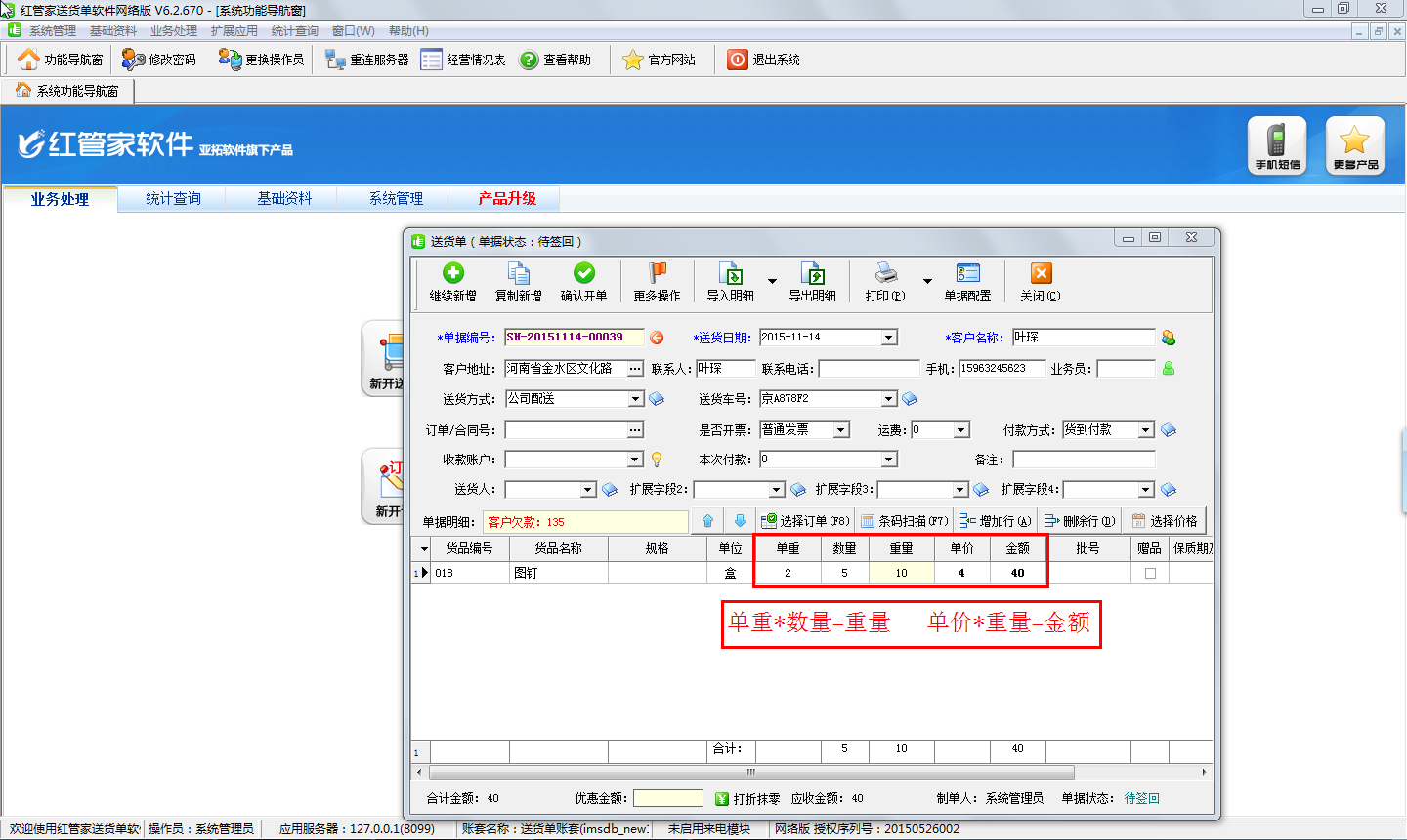 亞拓軟件開發的紅管家送貨單軟件中支持按重量計算金額,由于多數用戶是按數量來計算金額的,因此在送貨單打印軟件中開單時,明細中的金額默認取單價乘以數量的值(即 金額 = 單價 * 數量),那么部分用戶的產品如果需要按重量計算金額(比如農副產品)在送貨單管理軟件中又該如何進行設置呢?下面我們就詳細介紹下紅管家送貨單軟件中如何設置按重量來計算金額? &nbs