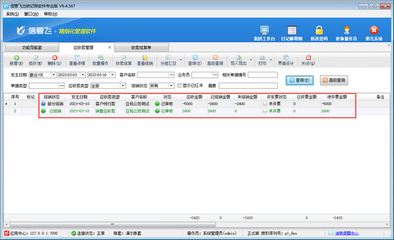 演示視頻觀看鏈接:客戶預付款部分沖銷銷售應收款,如何開收款結算單演示視頻 客戶預付款是客戶提前預付給我們的金額,可以用來沖銷銷售產生的應收款,本文以信管飛出納記賬軟件為例演示一下客戶預付款部分沖銷銷售應收款,如何開收款結算單? 在功能導航窗點擊“往來管理”—》“應收款管理”打開應收款管理界面,如下圖所