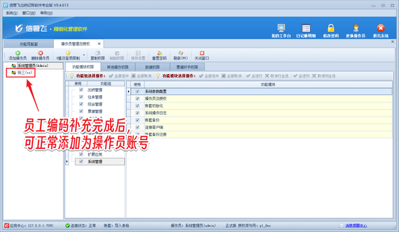 有使用信管飛軟件的用戶,在設置操作員賬號時,添加操作員賬號不成功,如下圖所示。 演示視頻觀看鏈接:信管飛軟件操作員賬號添加不成功,如何解決演示視頻 出現(xiàn)以上問題的原因是:被添加為操作員賬號的員工信息沒有員工編碼導致(一般通過導入表格生成的員工信息可能不存在員工編碼,如導入日記賬表格時,直接