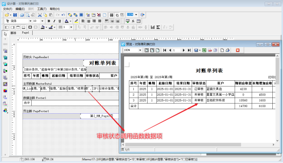 單據審核狀態是指在業務流程中,單據處于審核流程的不同階段所呈現的狀態,它反映了單據處理進展與結果,信管飛RMS開單審核后查詢界面顯示審核狀態,在對賬統計打印時,支持打印單據的審核狀態。 打印對賬單時同樣需要打印“審核狀態”,但是在設計模板時直接調用[統計信息.審核]數據項,打印預覽對賬單時,審核狀態會