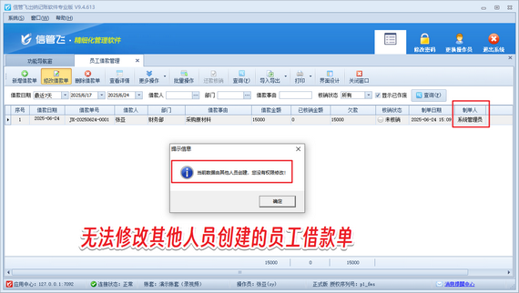 在財務(wù)管理的日常工作中,員工借款單的權(quán)限管控是確保數(shù)據(jù)安全與責任明確的關(guān)鍵環(huán)節(jié)。信管飛出納記賬軟件通過靈活的權(quán)限配置功能,可實現(xiàn)操作員僅能編輯本人創(chuàng)建的借款單,而無法修改他人單據(jù)。本文將詳細介紹如何通過軟件設(shè)置,實現(xiàn)操作員無法修改他人創(chuàng)建的員工借款單,保障財務(wù)數(shù)據(jù)的完整性與合規(guī)性。 演示視頻觀看鏈接:出納記賬軟件如何設(shè)置操作