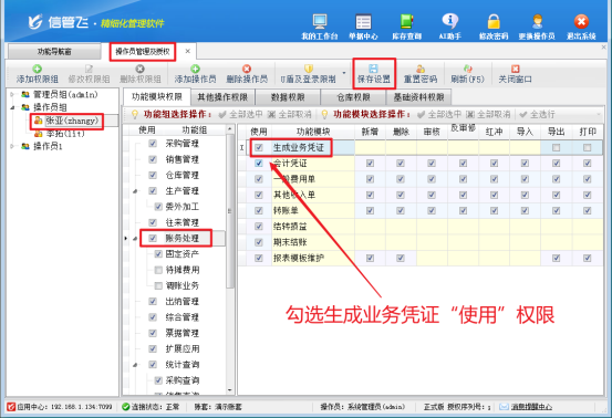 信管飛RMS專業(yè)版包含財(cái)務(wù)處理模塊,支持用戶高效、準(zhǔn)確地登記會(huì)計(jì)憑證,為企業(yè)的財(cái)務(wù)管理提供堅(jiān)實(shí)的數(shù)據(jù)基礎(chǔ)。在實(shí)際使用過(guò)程中,部分用戶反饋,當(dāng)使用操作賬號(hào)登錄軟件進(jìn)行賬務(wù)處理時(shí),界面中未顯示生成業(yè)務(wù)憑證模塊,而系統(tǒng)管理員賬號(hào)登錄后該模塊卻能正常顯示,這是因?yàn)椴僮鲉T沒有生成業(yè)務(wù)憑證權(quán)限導(dǎo)致的,本篇文章介紹下如何解決?