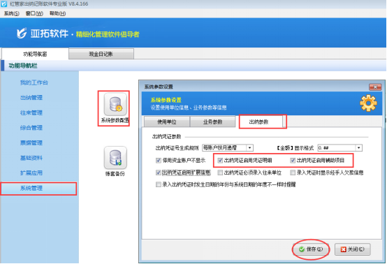 紅管家出納記賬軟件、亞拓管理軟件(標準版、專業版)中的出納管理模塊,在新增憑證中有的需要填寫輔助項目和憑證明細,軟件支持設置在新增憑證時顯示這些項目。下邊以出納軟件為例,展示一下如何設置憑證顯示憑證明細和輔助項目項。 打開“系統管理”—》“系統參數”,選擇出納參數界面選擇對應的出納參數進行勾選保存。具體如下圖1所示: