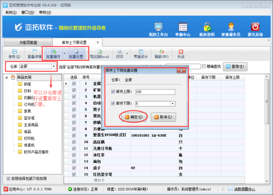 亞拓管理軟件專業版、標準版、星光版和紅管家倉庫管理軟件支持庫存管理功能,為了更直觀的發現庫存數量,軟件中可以對商品庫存數量進行庫存上下限設置,并可以在倉庫管理模塊中的“相關查詢統計”中進行庫存預警查詢。 以“亞拓管理軟件專業版”為例,介紹如何設置庫存的上下限數量,在功能導航窗選擇“倉庫管理”—》“庫存上下限”進入庫存上下限設